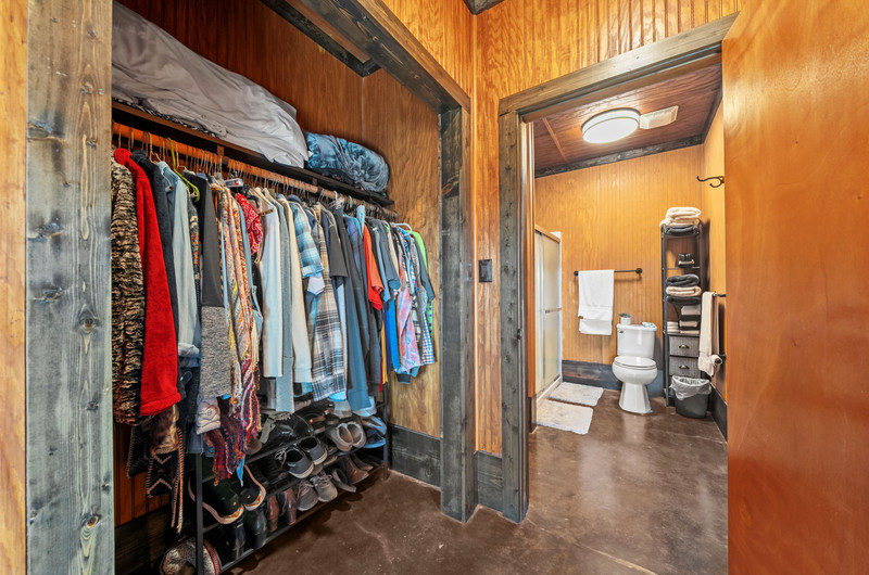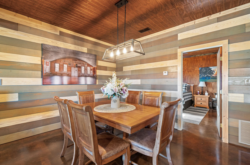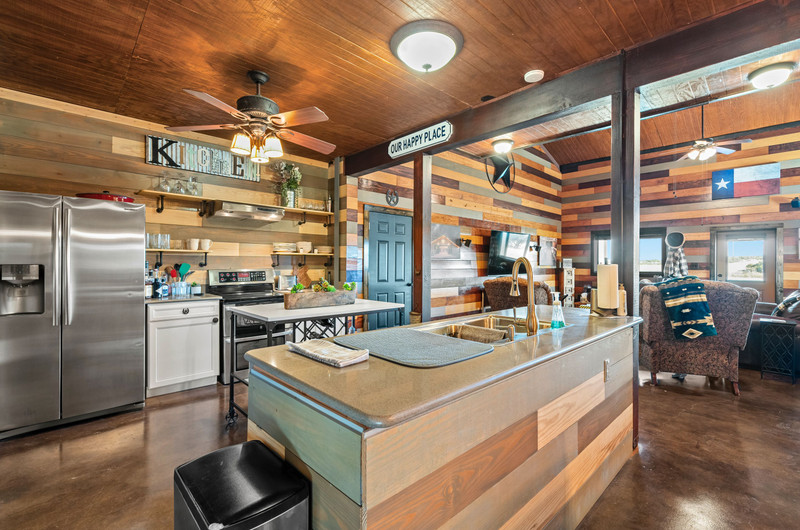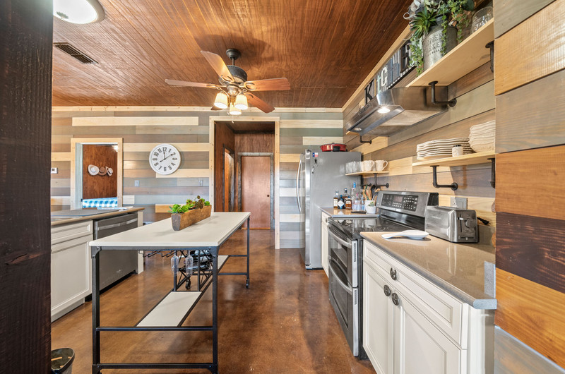 The 2-story barndo offers 4BR/2.5BA, 2,270 SF living plus a 1,250 SF wrap-around porch and fire pit. Inside, vaulted great room with reclaimed-wood plank walls, stained concrete floors and big-view windows; warm kitchen with stainless appliances, open shelving, large island and coffee bar. A walk-through closet with in-closet washer/dryer leads to the downstairs primary suite.