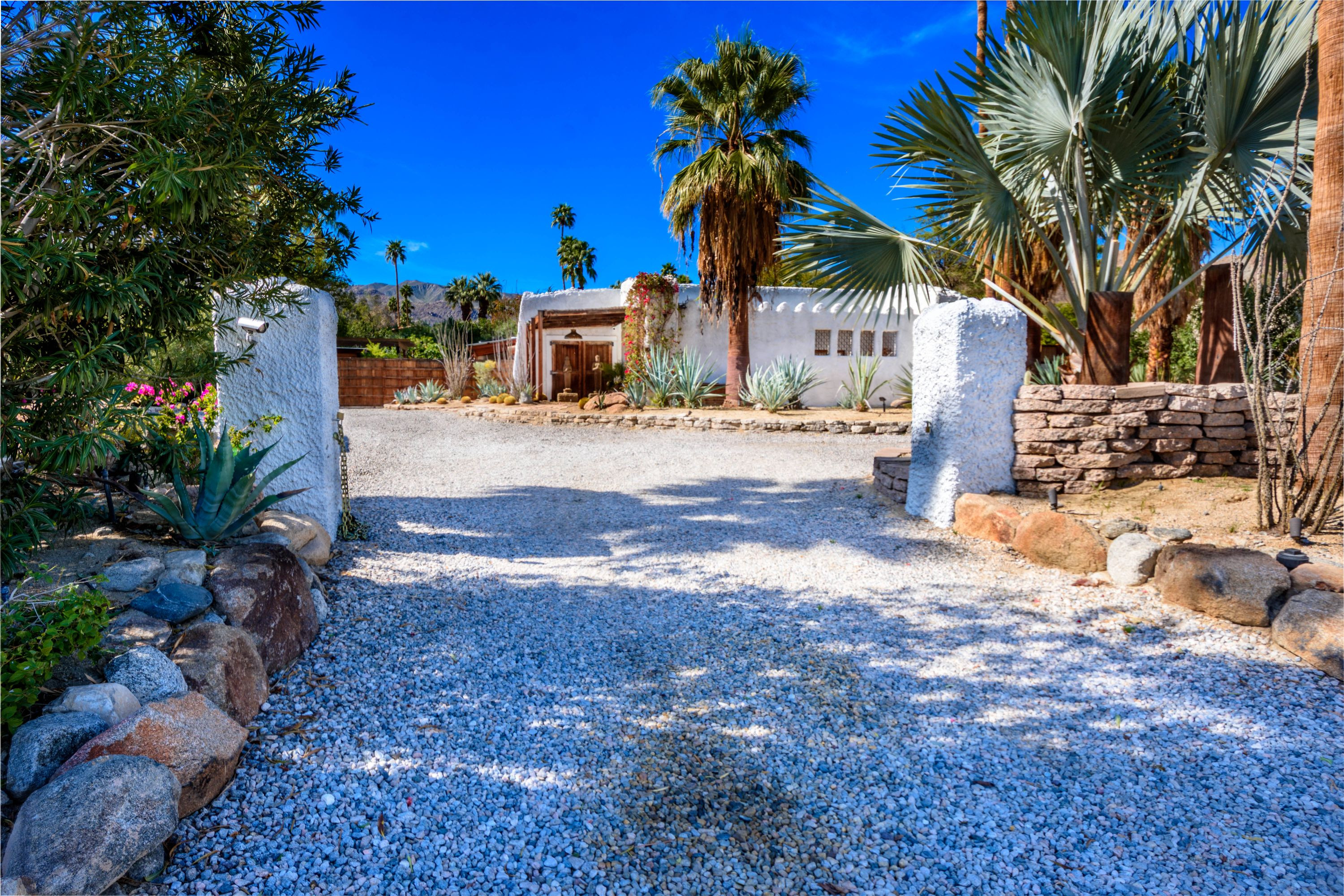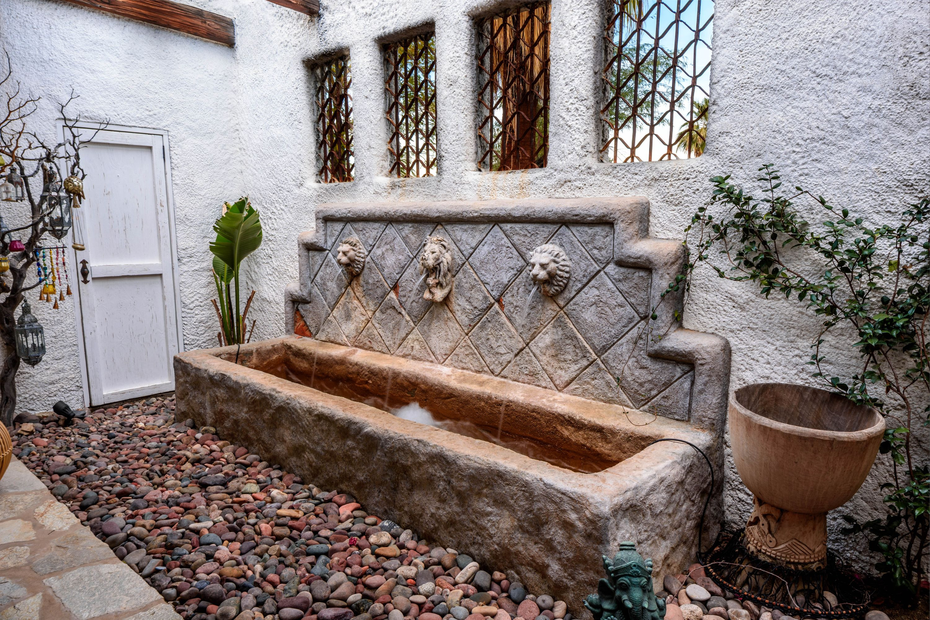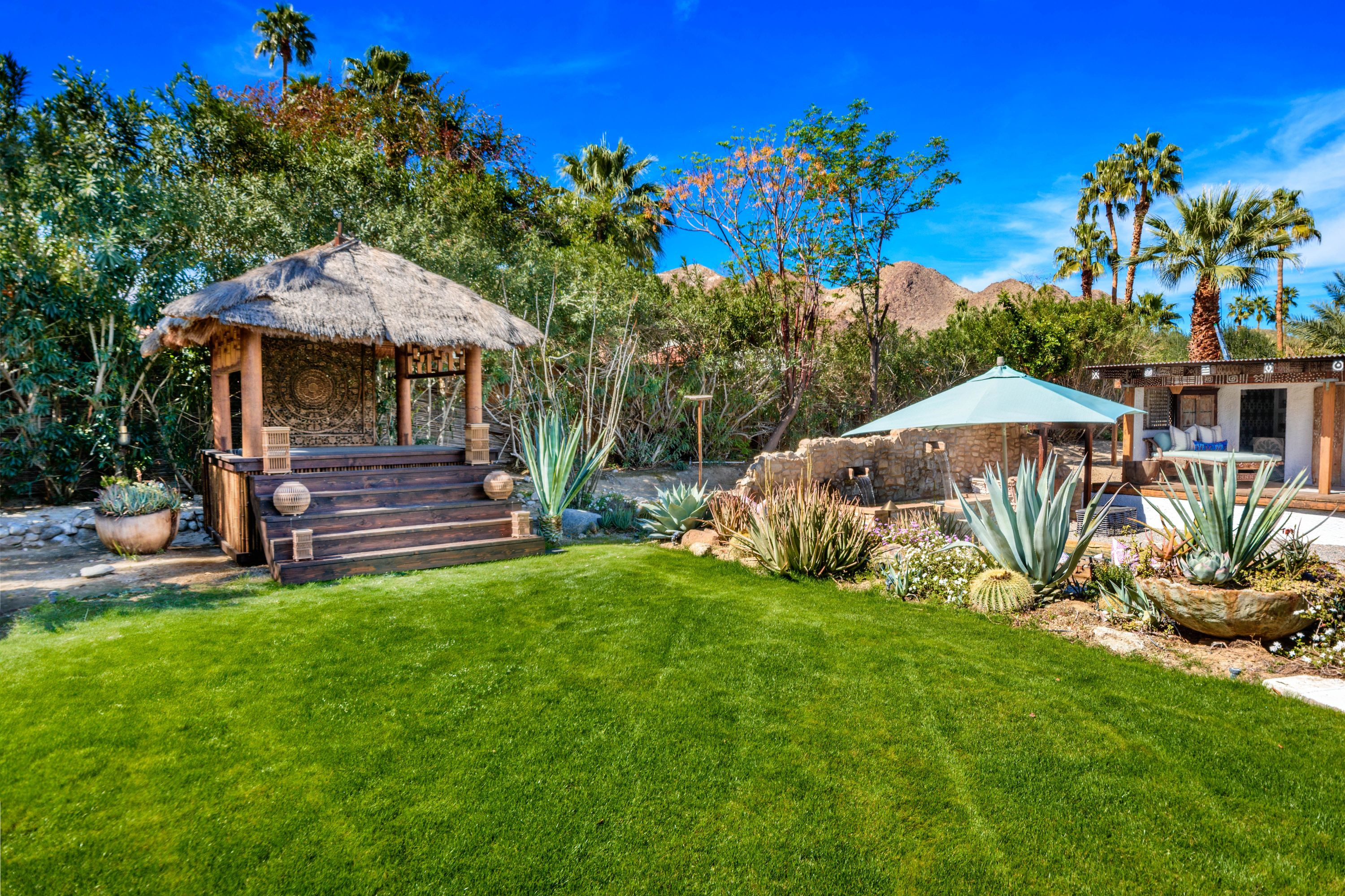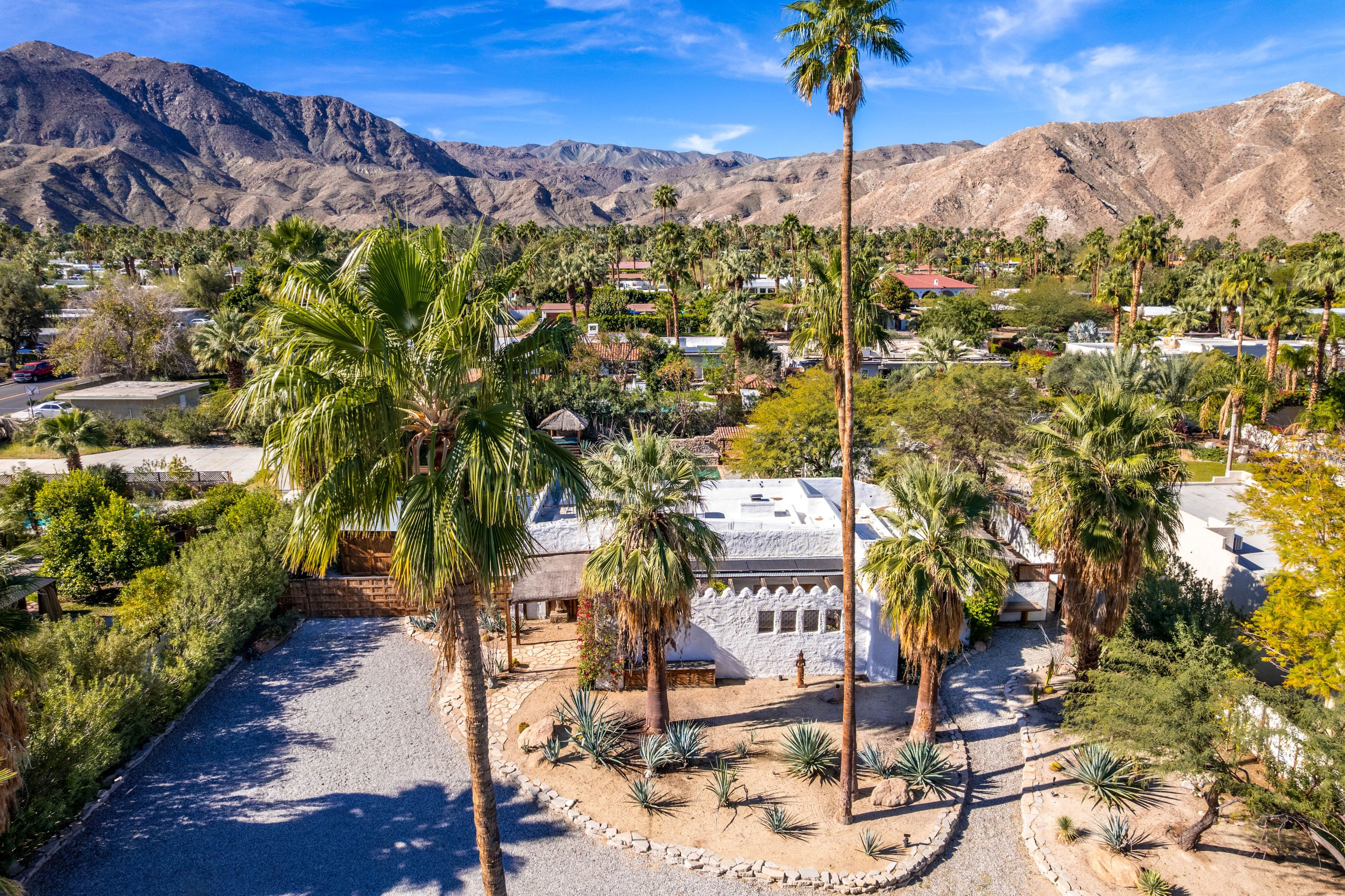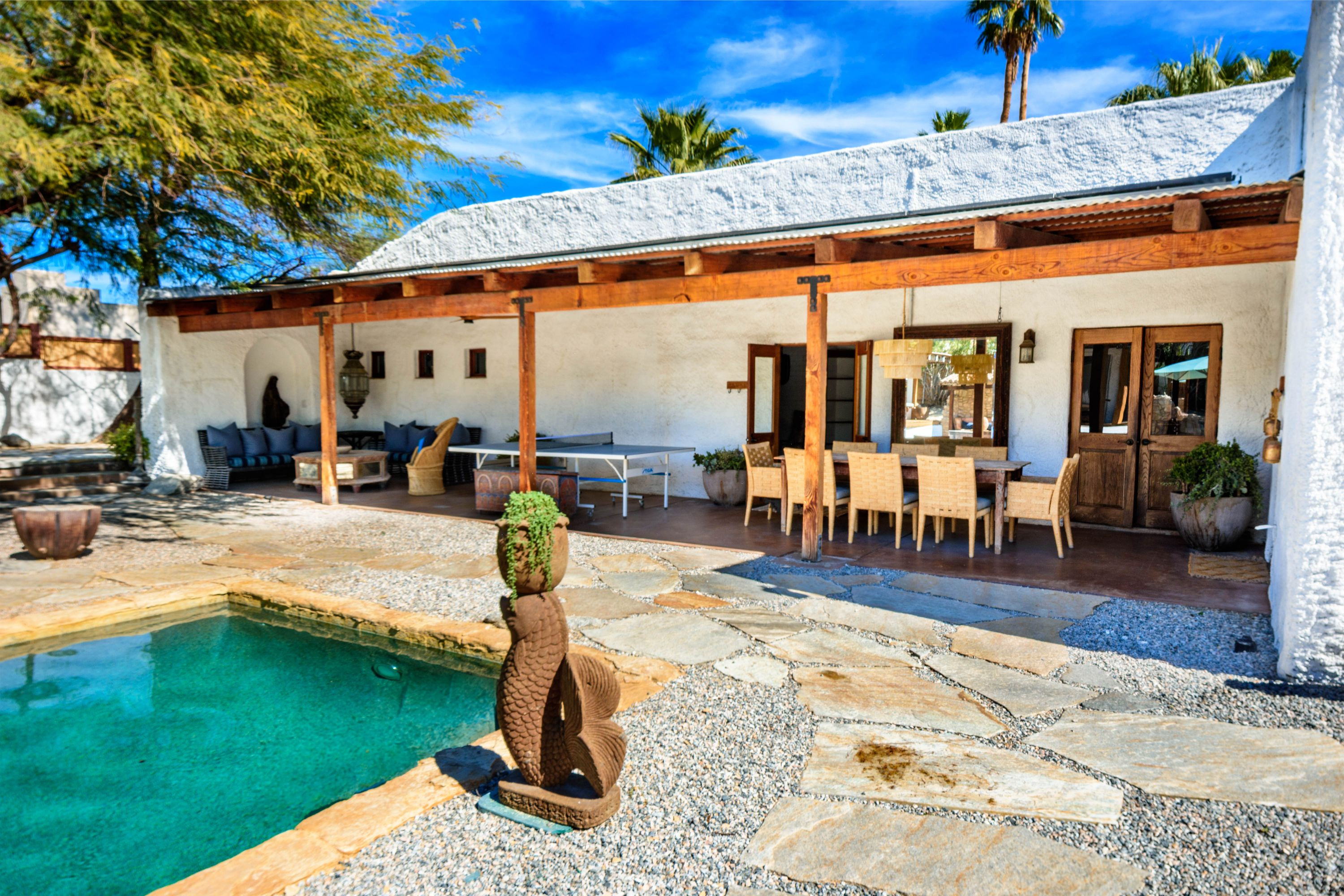 The Moroccan of Rancho Mirage is a true taste of Tangiers in the middle of the Californian desert. Originally built in 1950 this historical estate is a walled, gated oasis sitting on nearly an acre of land. Re-imaged by acclaimed designer Colas Moore it is both full of original charm and well considered luxurious detail. Behind solid mahogany doors a serene fountain lined indoor courtyard welcomes you into the Hacienda style property. The house features a large master suite with private bath at one end and two further bedrooms and a bathroom at the other, with outside soaking tub and shower near guest bedrooms. A newly renovated modern kitchen finished with high end appliances and comfortable dining area flanks the spacious living room featuring vaulted wood beam ceilings, fireplace and quartzite flooring. The adjacent den opens up to a beautifully landscaped garden with citrus trees, magnificent lap pool and shaded napping cabanas. A large outdoor BBQ station and firepit lounge provide the perfect alfresco dining experience complete with panoramic mountain views. There's additional 1114 SF not calculated in assessors' information. New spa added in December 2025.