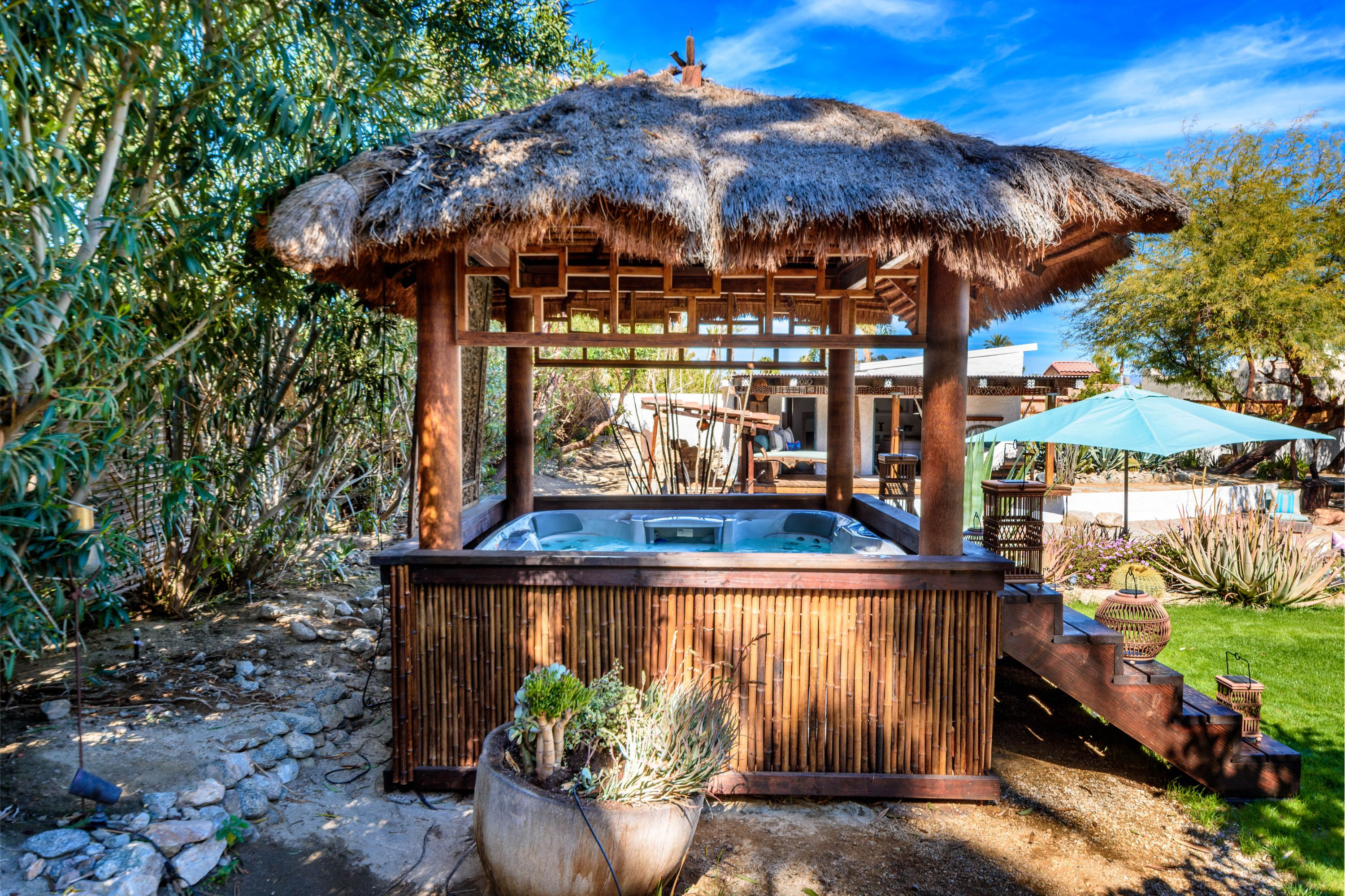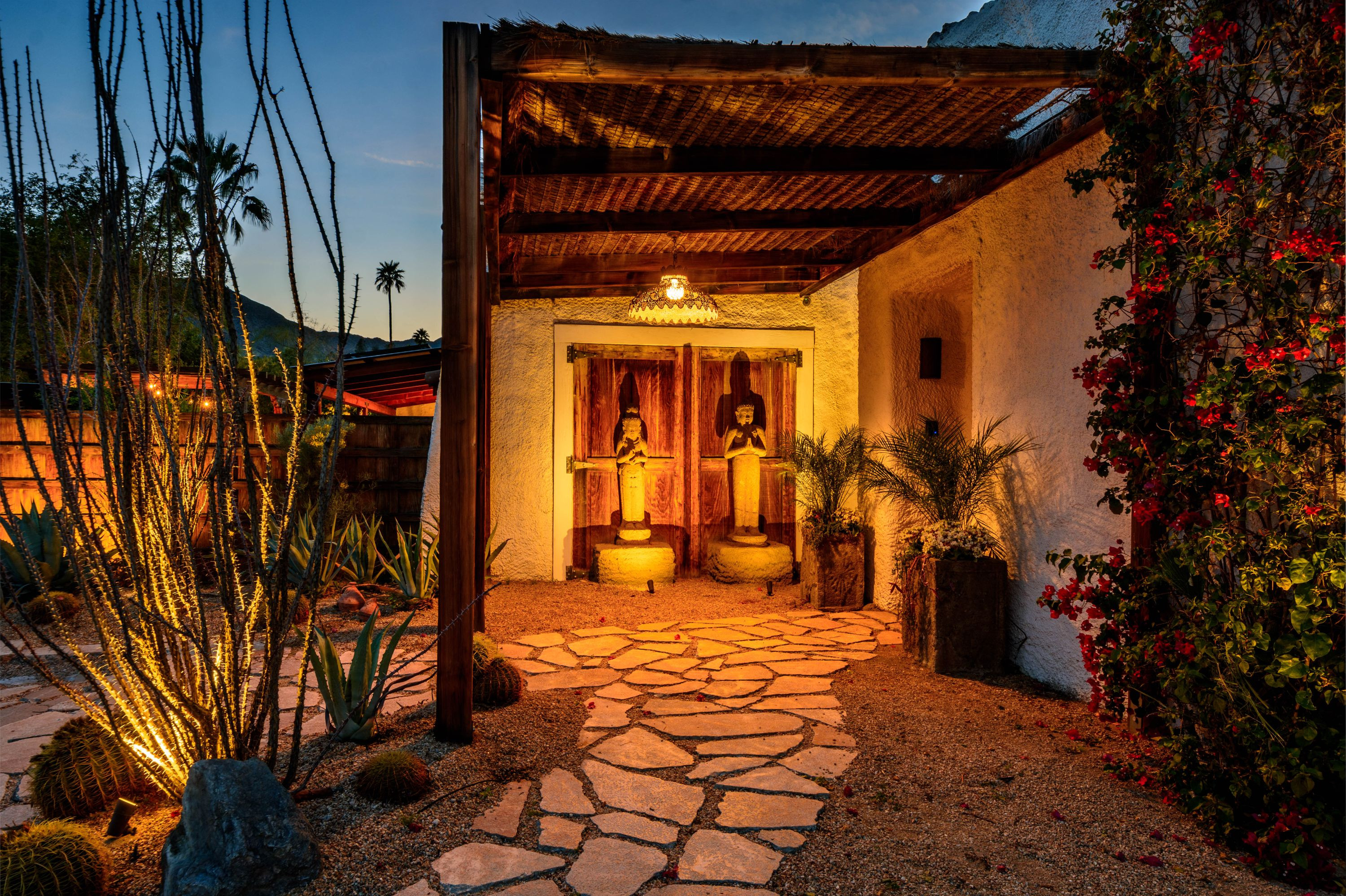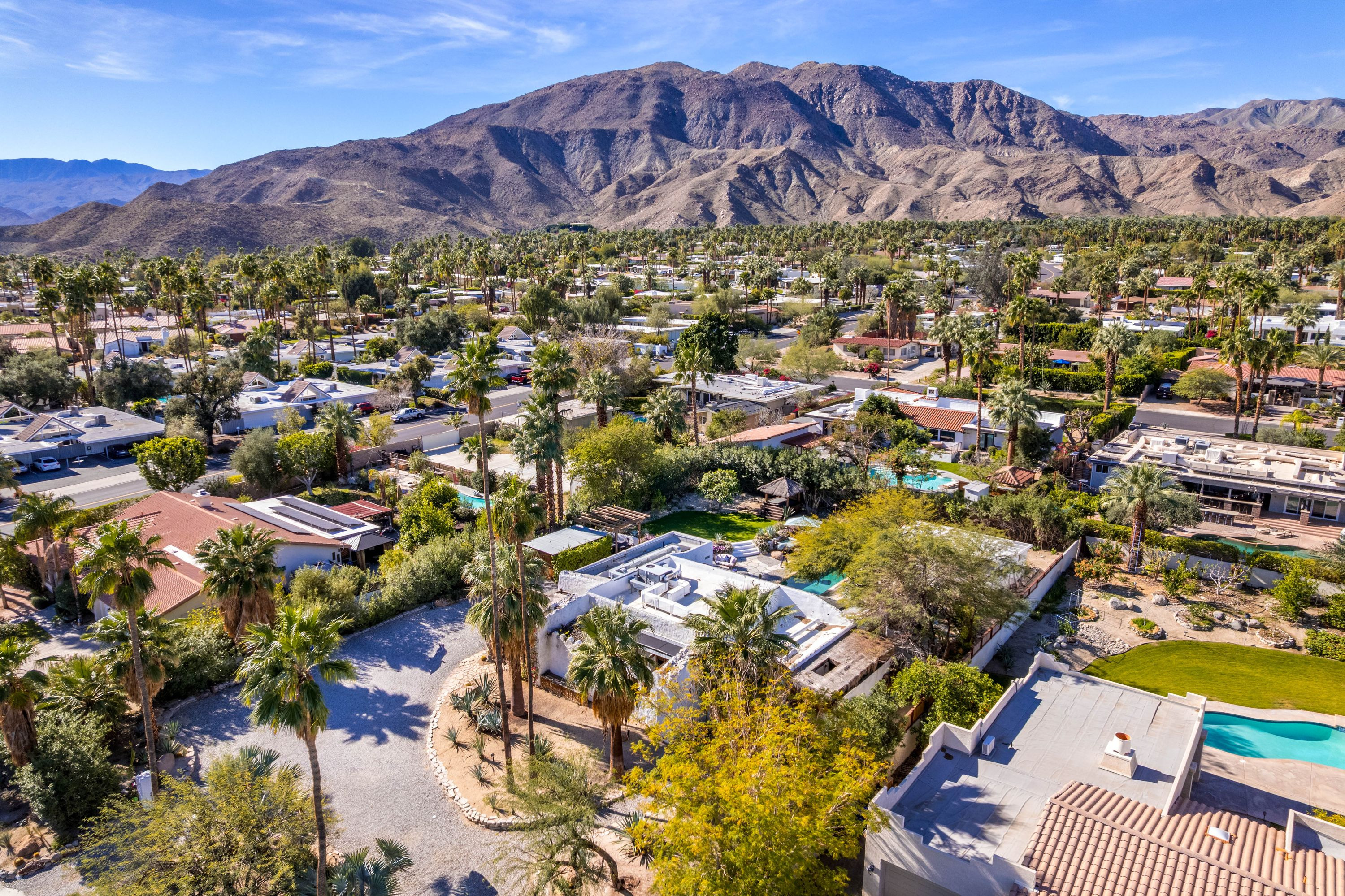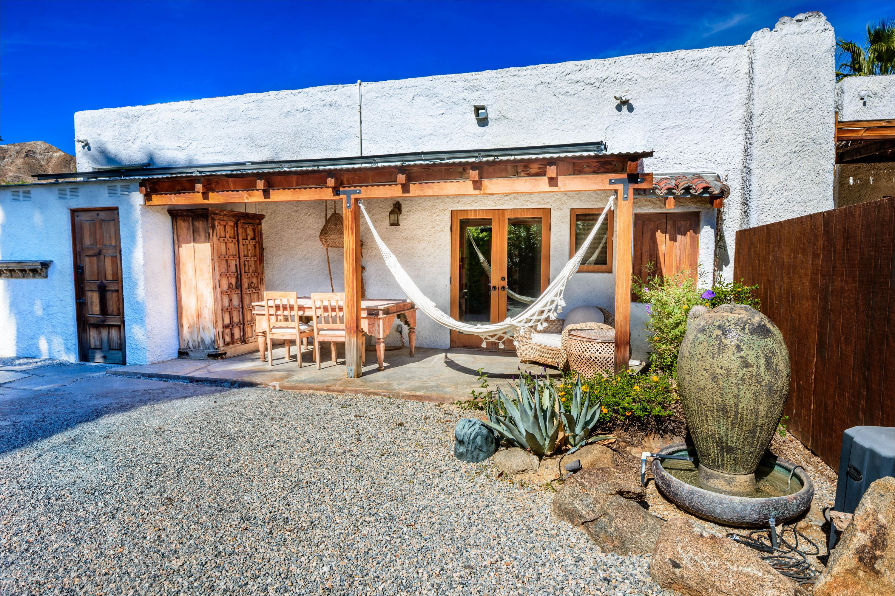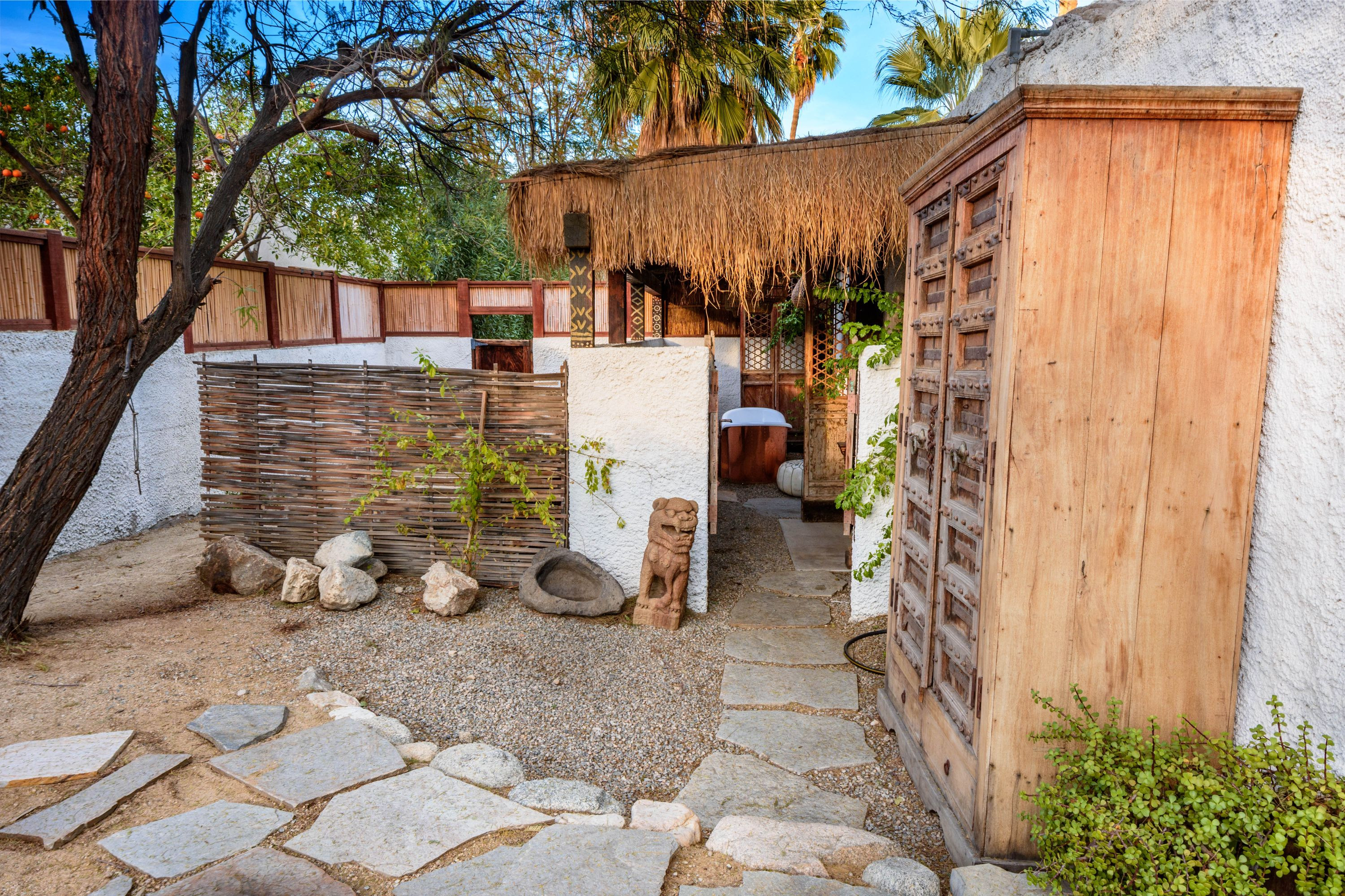 The Moroccan of Rancho Mirage is a true taste of Tangiers in the middle of the Californian desert. Originally built in 1950 this historical estate is a walled, gated oasis sitting on nearly an acre of land. Re-imaged by acclaimed designer Colas Moore it is both full of original charm and well considered luxurious detail. Behind solid mahogany doors a serene fountain lined indoor courtyard welcomes you into the Hacienda style property. The house features a large master suite with private bath at one end and two further bedrooms and a bathroom at the other, with outside soaking tub and shower near guest bedrooms. A newly renovated modern kitchen finished with high end appliances and comfortable dining area flanks the spacious living room featuring vaulted wood beam ceilings, fireplace and quartzite flooring. The adjacent den opens up to a beautifully landscaped garden with citrus trees, magnificent lap pool and shaded napping cabanas. A large outdoor BBQ station and firepit lounge provide the perfect alfresco dining experience complete with panoramic mountain views. There's additional 1114 SF not calculated in assessors' information. New spa added in December 2025.