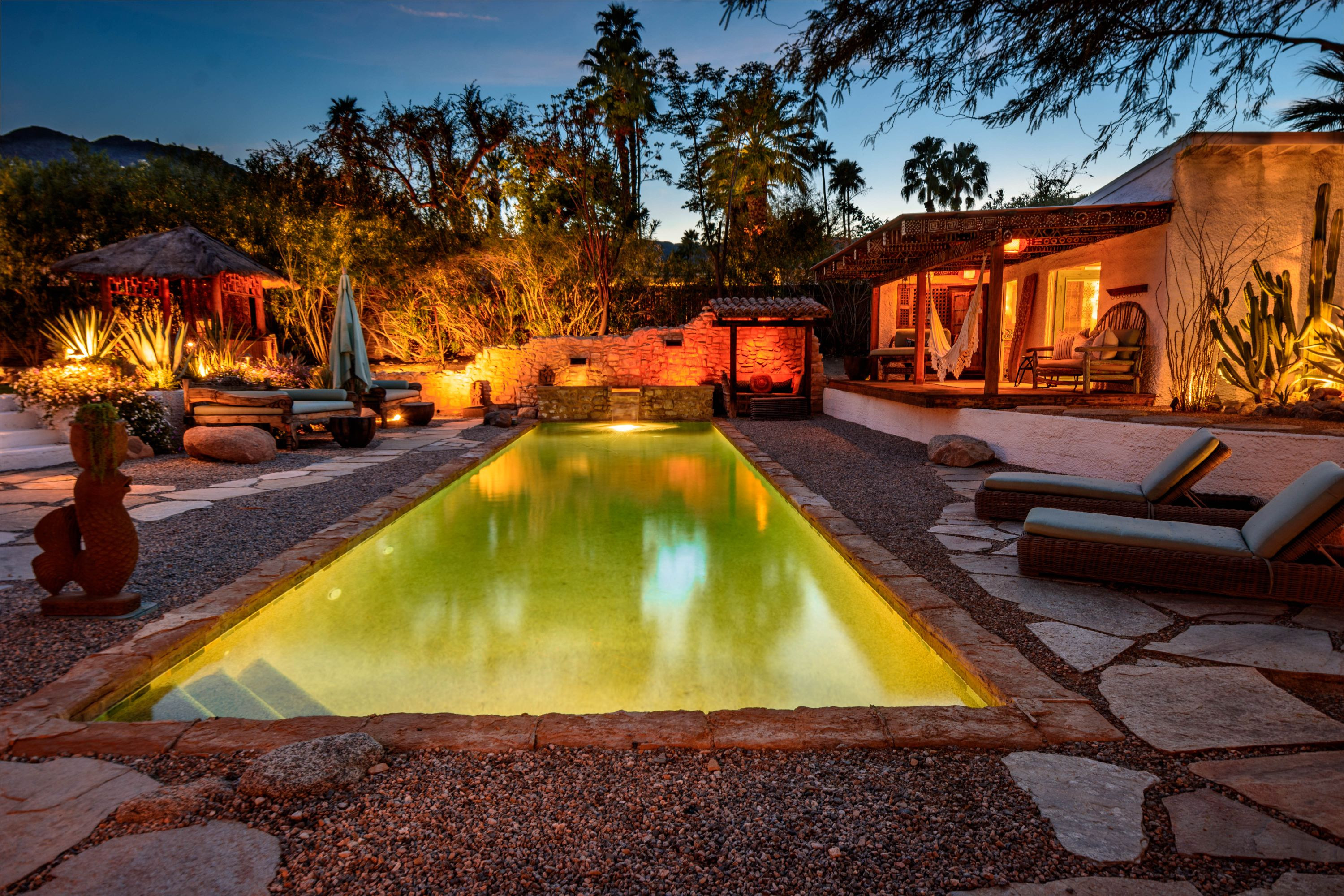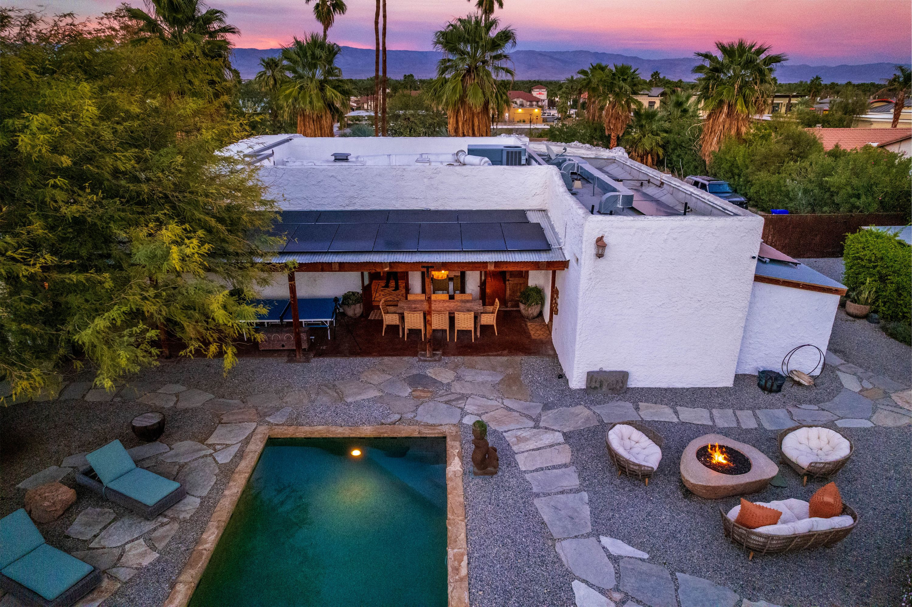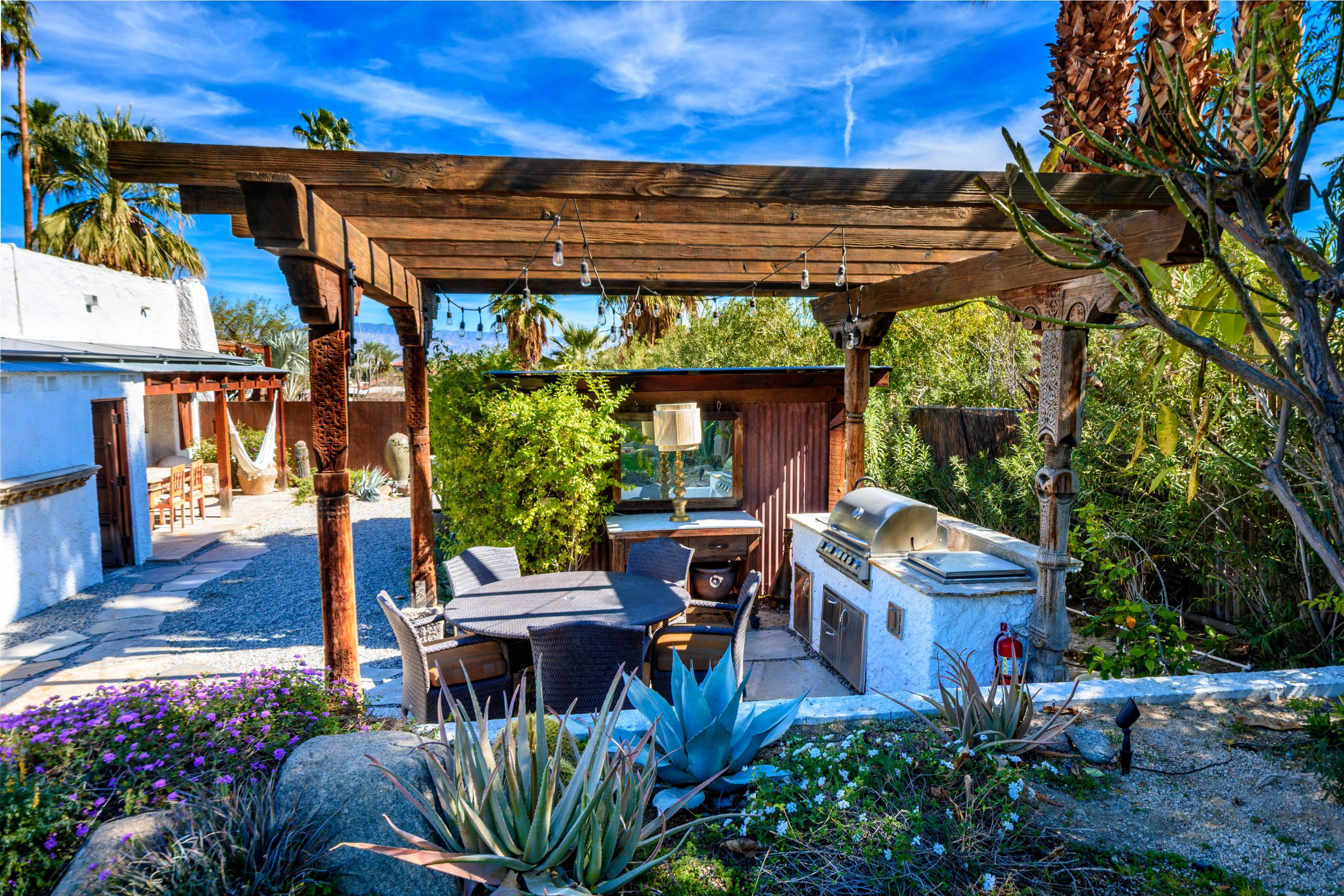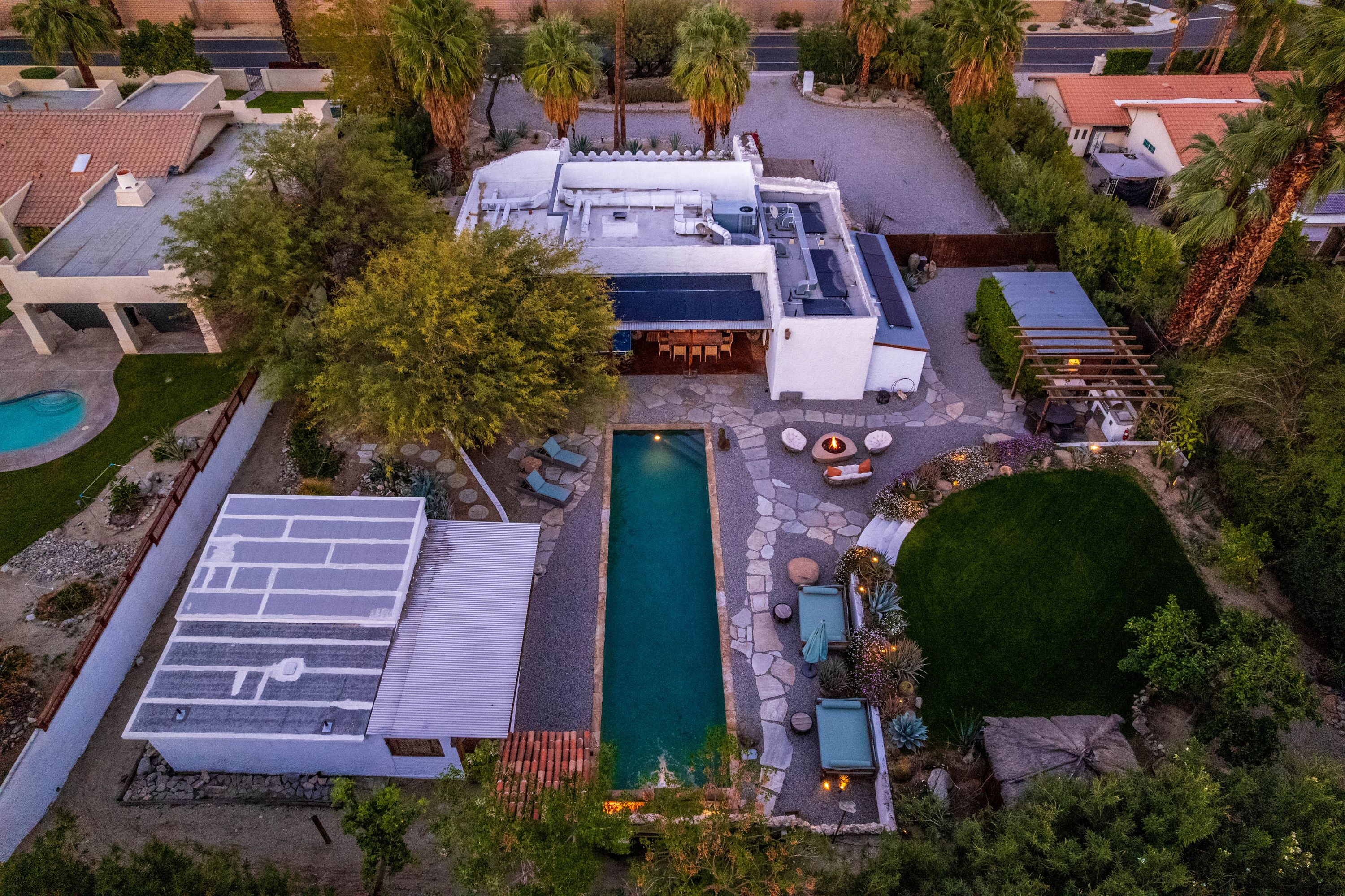The Moroccan of Rancho Mirage is a true taste of Tangiers in the middle of the Californian desert. Originally built in 1950 this historical estate is a walled, gated oasis sitting on nearly an acre of land. Re-imaged by acclaimed designer Colas Moore it is both full of original charm and well considered luxurious detail. Behind solid mahogany doors a serene fountain lined indoor courtyard welcomes you into the Hacienda style property. The house features a large master suite with private bath at one end and two further bedrooms and a bathroom at the other, with outside soaking tub and shower near guest bedrooms. A newly renovated modern kitchen finished with high end appliances and comfortable dining area flanks the spacious living room featuring vaulted wood beam ceilings, fireplace and quartzite flooring. The adjacent den opens up to a beautifully landscaped garden with citrus trees, magnificent lap pool and shaded napping cabanas. A large outdoor BBQ station and firepit lounge provide the perfect alfresco dining experience complete with panoramic mountain views. There's additional 1114 SF not calculated in assessors' information. New spa added in December 2025.
