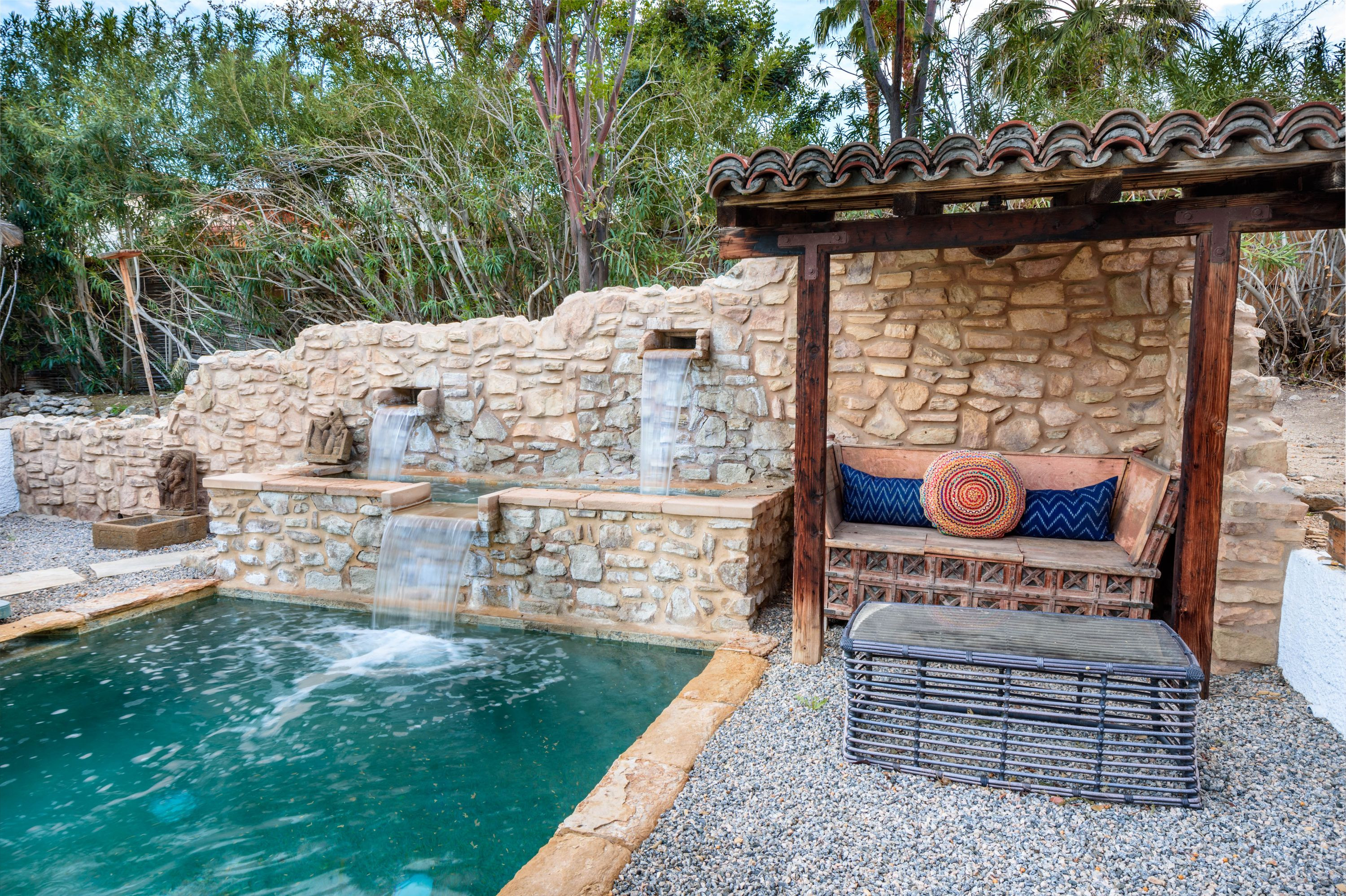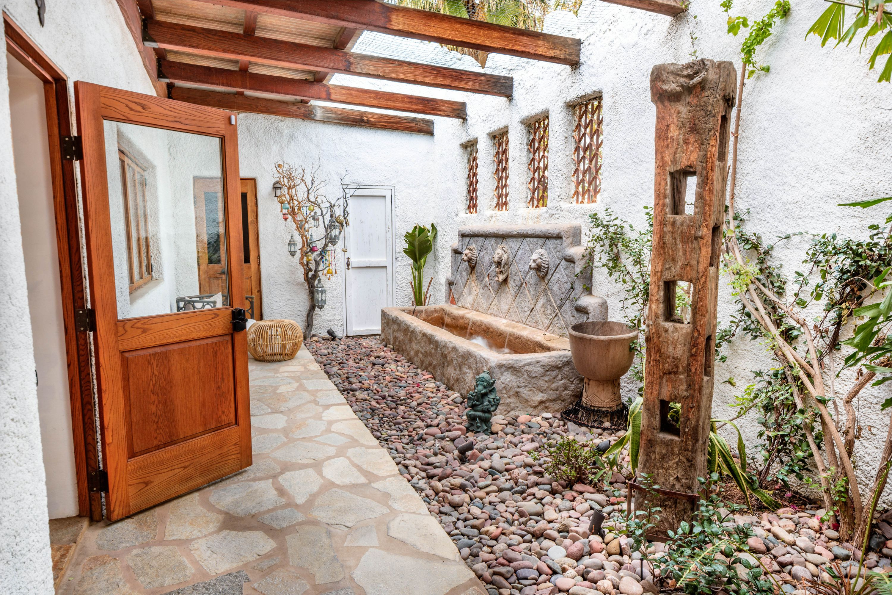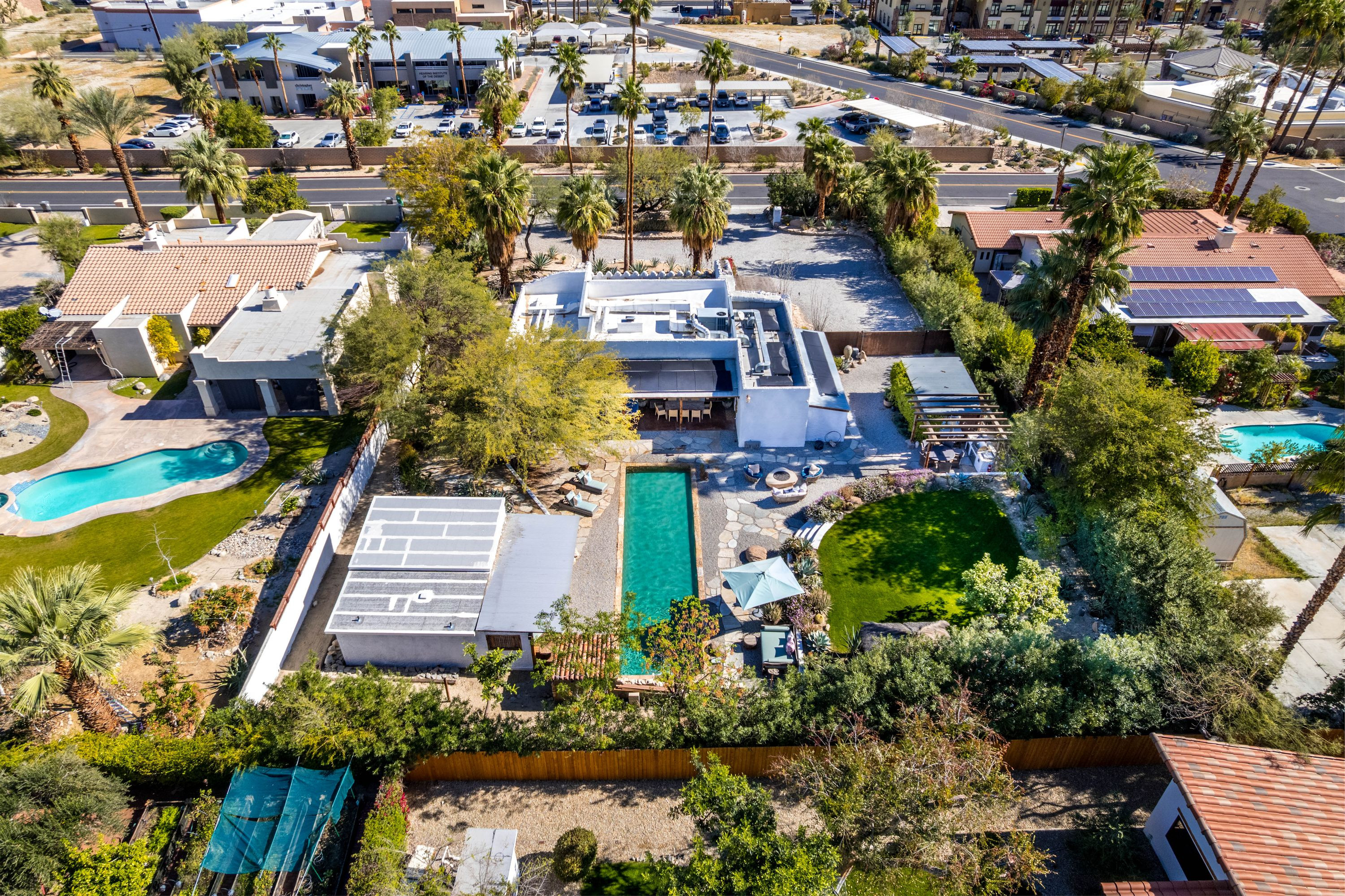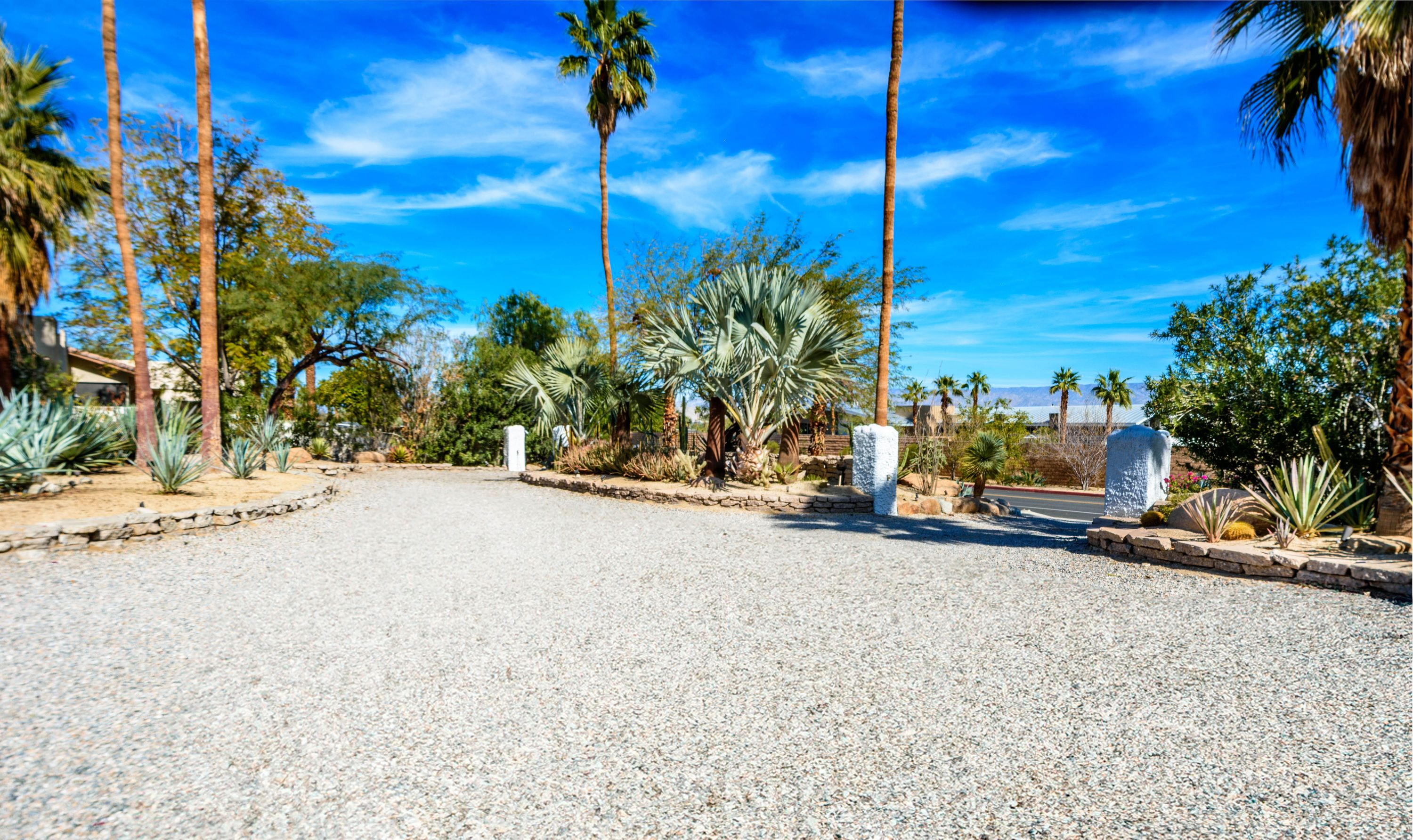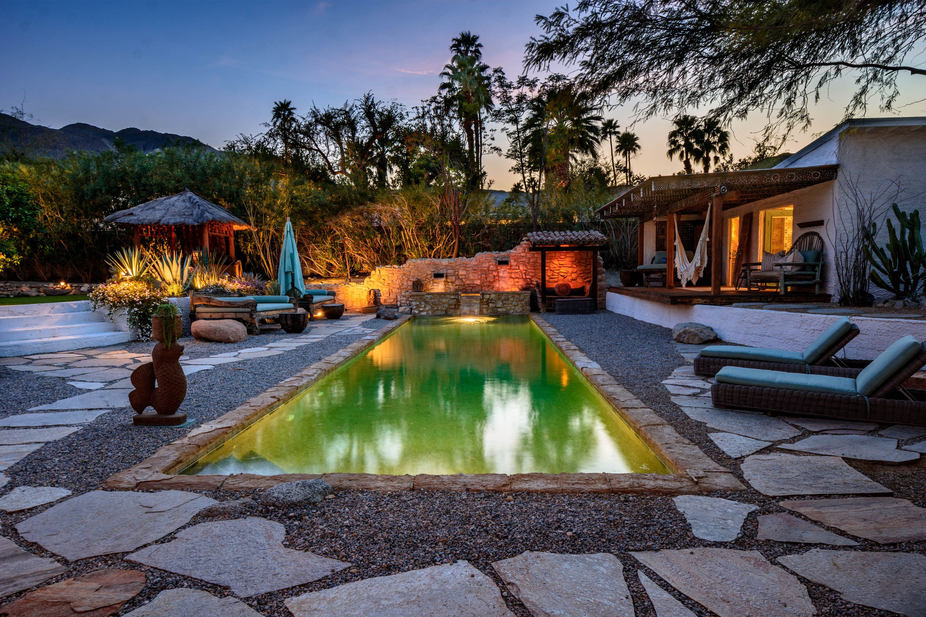 The Moroccan of Rancho Mirage is a true taste of Tangiers in the middle of the Californian desert. Originally built in 1950 this historical estate is a walled, gated oasis sitting on nearly an acre of land. Re-imaged by acclaimed designer Colas Moore it is both full of original charm and well considered luxurious detail. Behind solid mahogany doors a serene fountain lined indoor courtyard welcomes you into the Hacienda style property. The house features a large master suite with private bath at one end and two further bedrooms and a bathroom at the other, with outside soaking tub and shower near guest bedrooms. A newly renovated modern kitchen finished with high end appliances and comfortable dining area flanks the spacious living room featuring vaulted wood beam ceilings, fireplace and quartzite flooring. The adjacent den opens up to a beautifully landscaped garden with citrus trees, magnificent lap pool and shaded napping cabanas. A large outdoor BBQ station and firepit lounge provide the perfect alfresco dining experience complete with panoramic mountain views. There's additional 1114 SF not calculated in assessors' information. New spa added in December 2025.