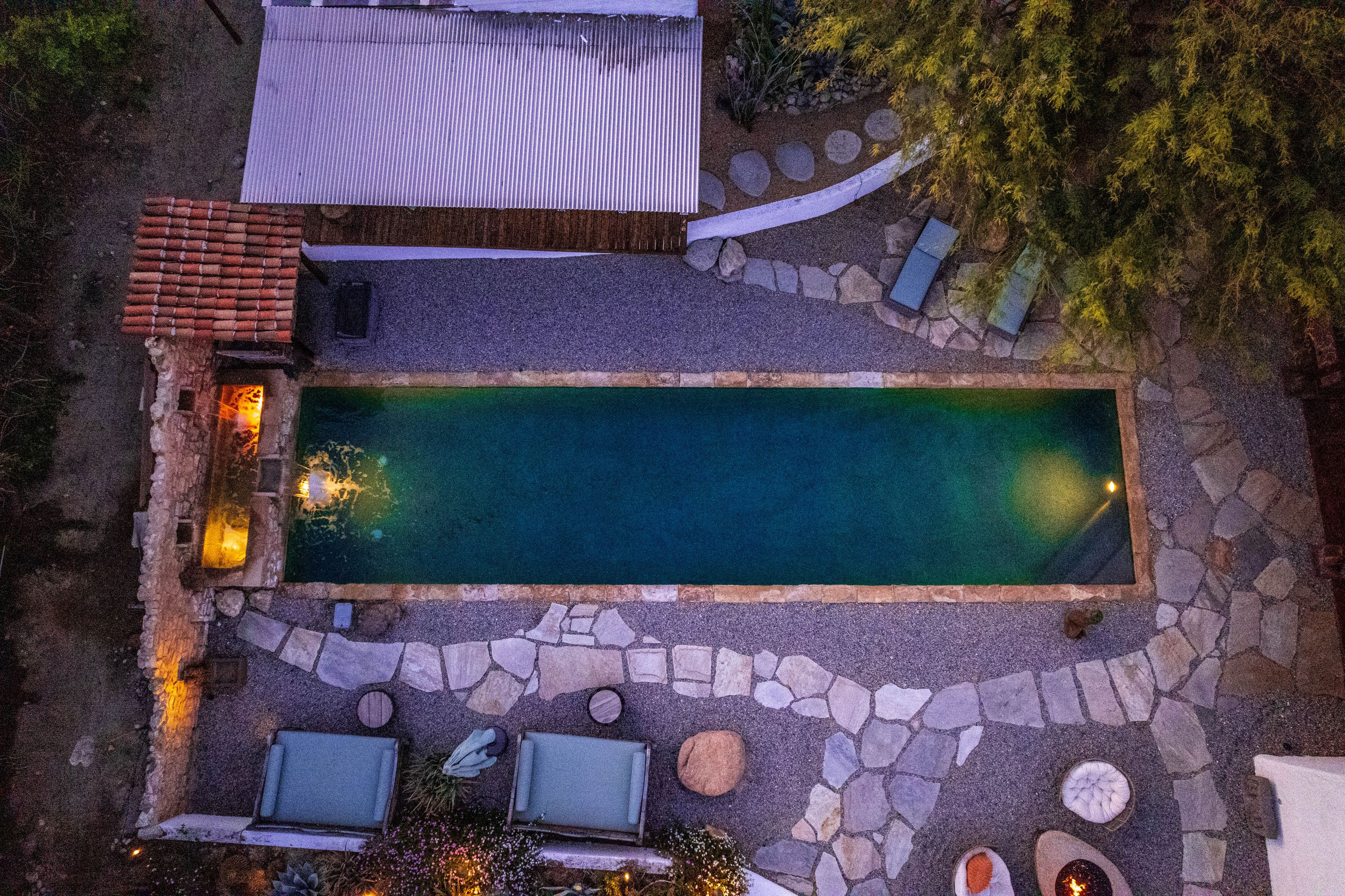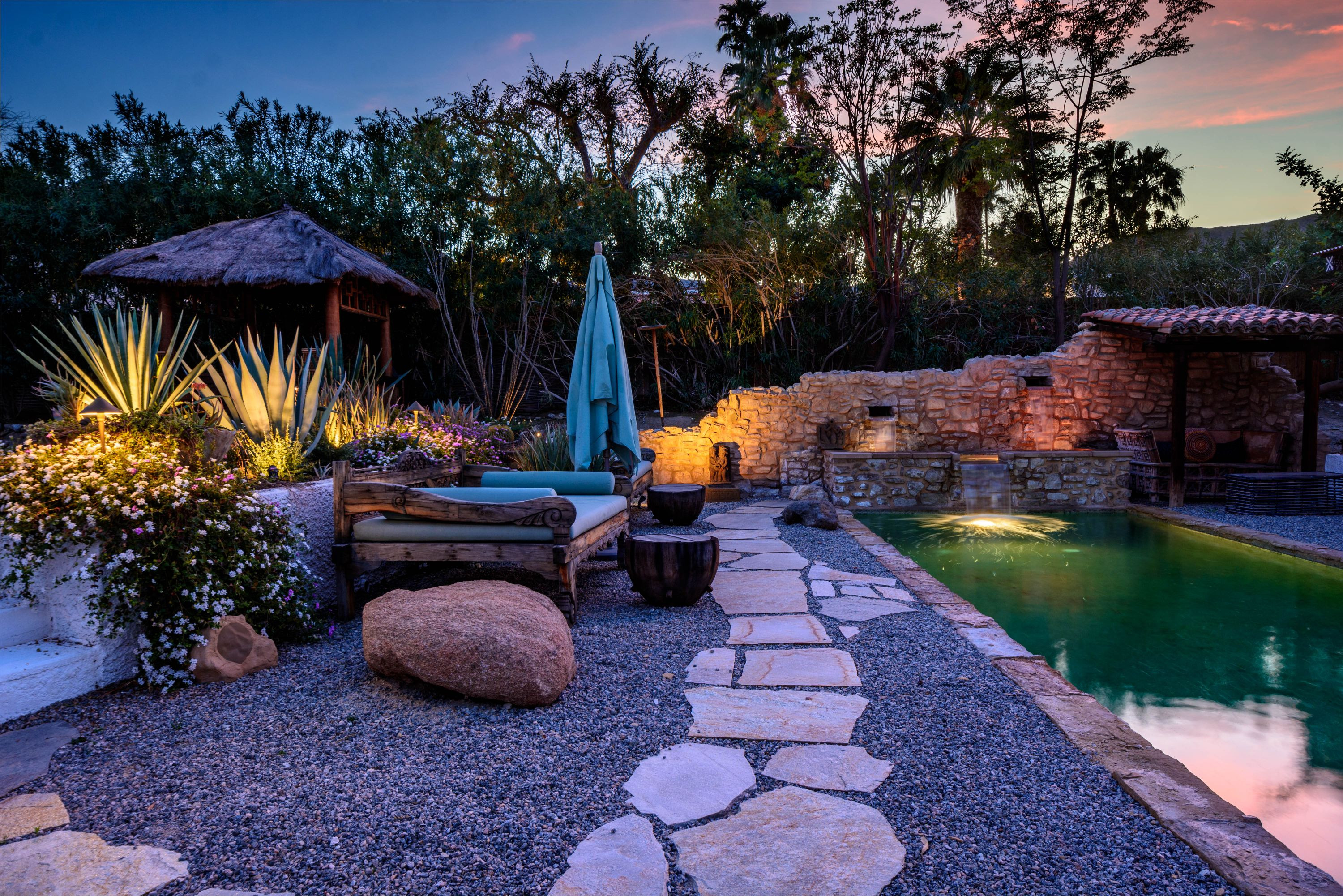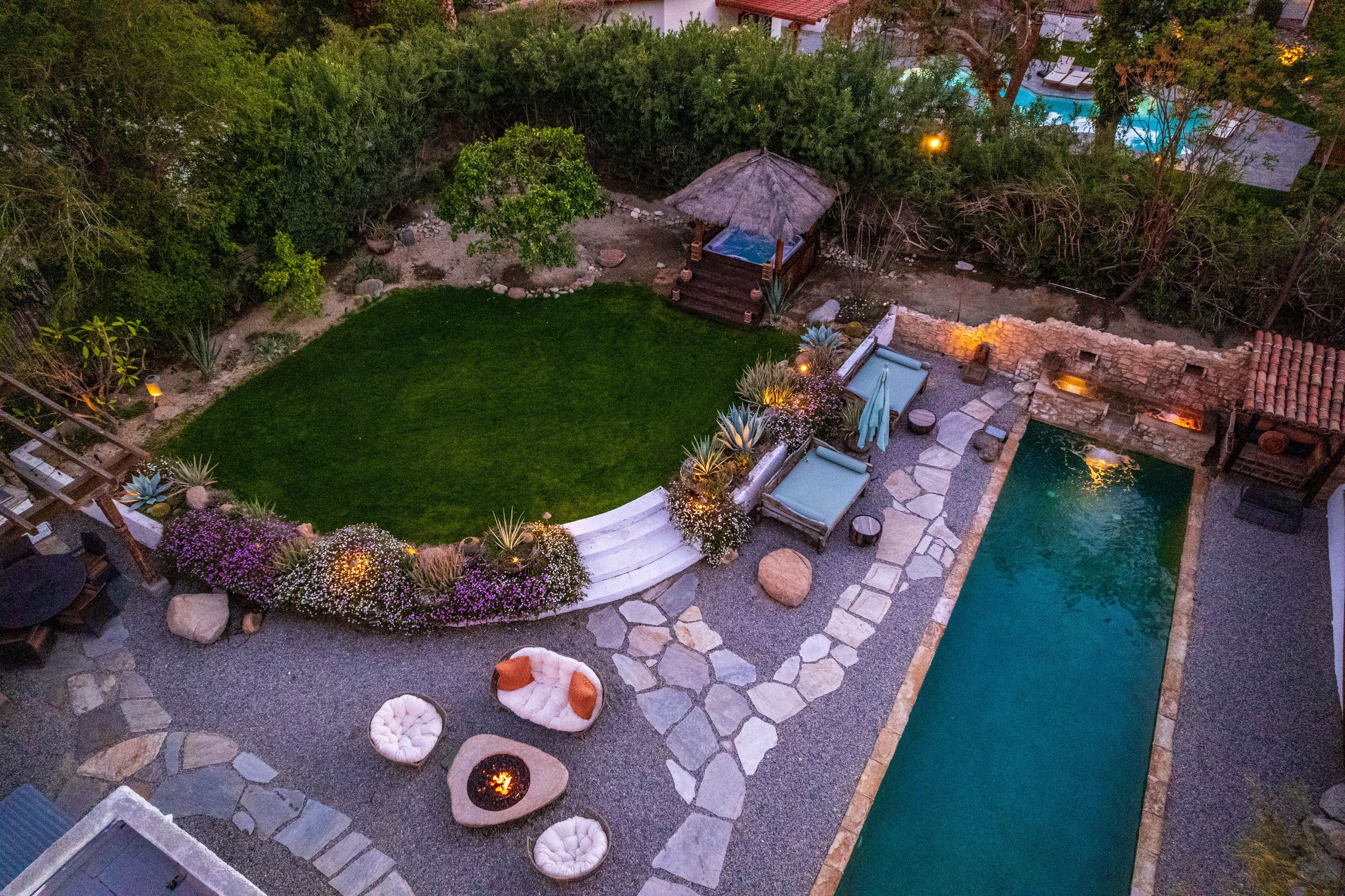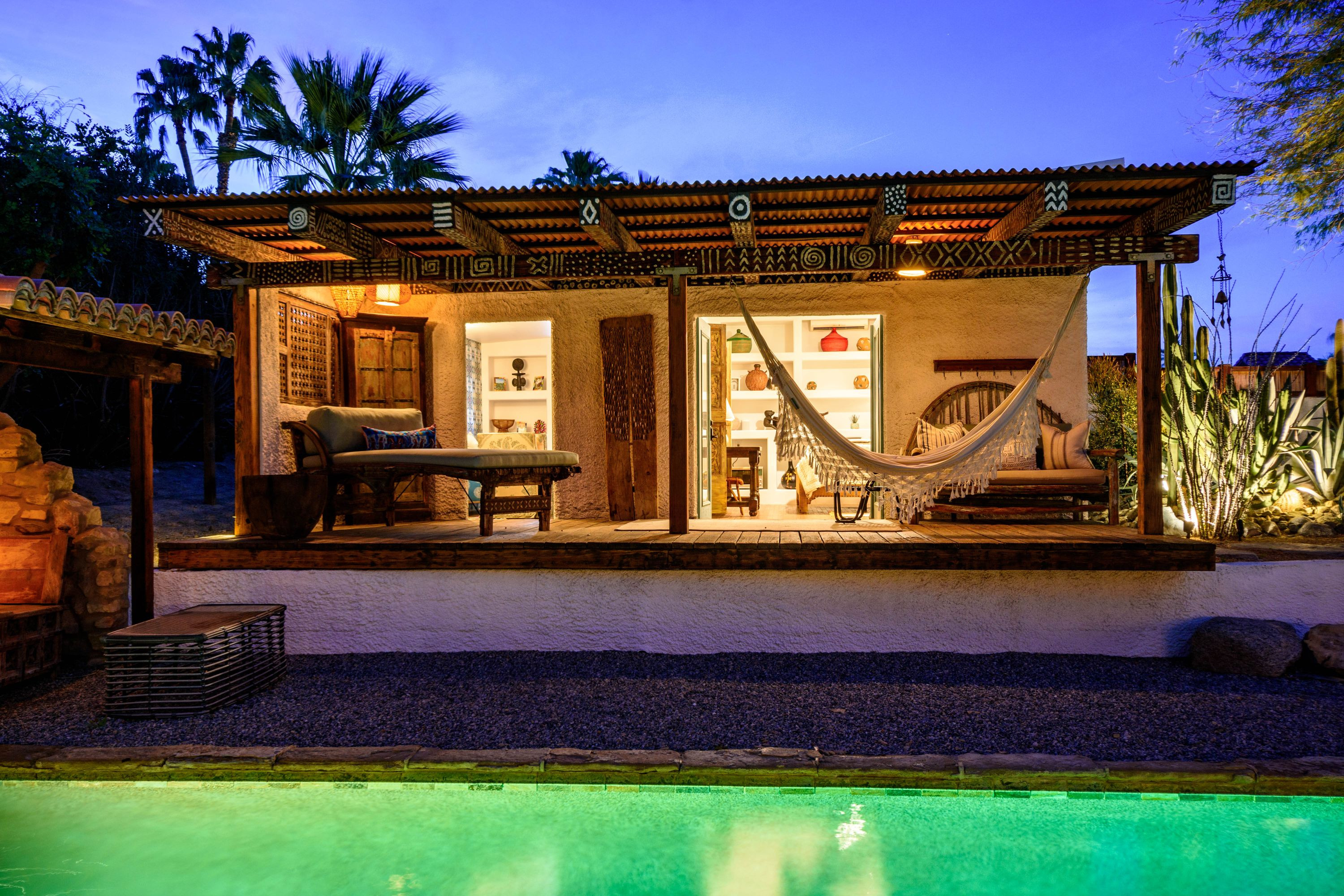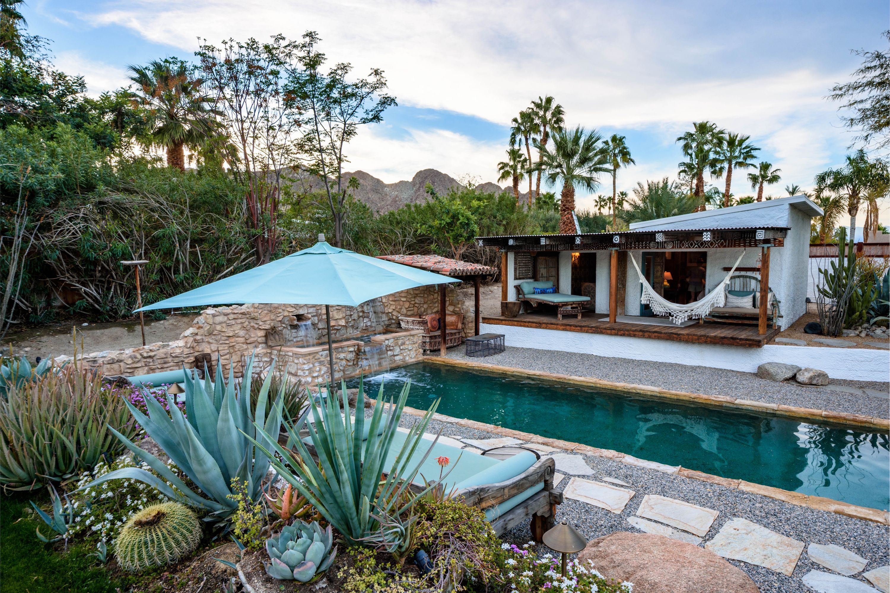 The Moroccan of Rancho Mirage is a true taste of Tangiers in the middle of the Californian desert. Originally built in 1950 this historical estate is a walled, gated oasis sitting on nearly an acre of land. Re-imaged by acclaimed designer Colas Moore it is both full of original charm and well considered luxurious detail. Behind solid mahogany doors a serene fountain lined indoor courtyard welcomes you into the Hacienda style property. The house features a large master suite with private bath at one end and two further bedrooms and a bathroom at the other, with outside soaking tub and shower near guest bedrooms. A newly renovated modern kitchen finished with high end appliances and comfortable dining area flanks the spacious living room featuring vaulted wood beam ceilings, fireplace and quartzite flooring. The adjacent den opens up to a beautifully landscaped garden with citrus trees, magnificent lap pool and shaded napping cabanas. A large outdoor BBQ station and firepit lounge provide the perfect alfresco dining experience complete with panoramic mountain views. There's additional 1114 SF not calculated in assessors' information. New spa added in December 2025.