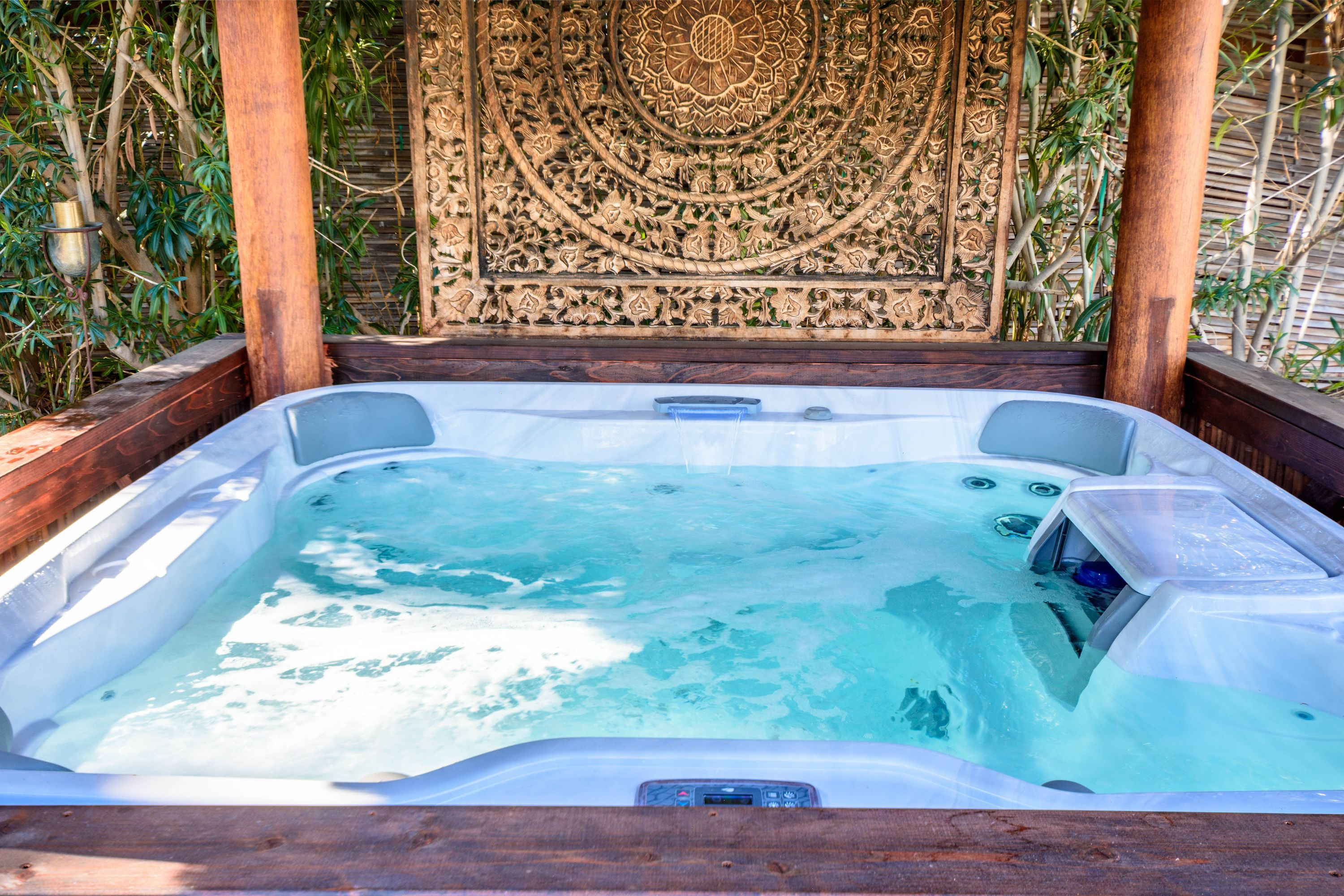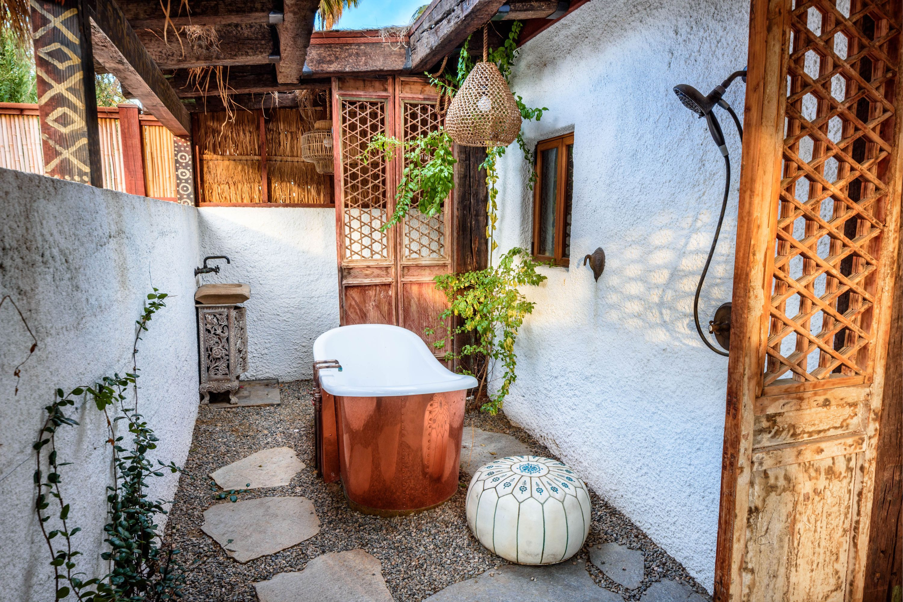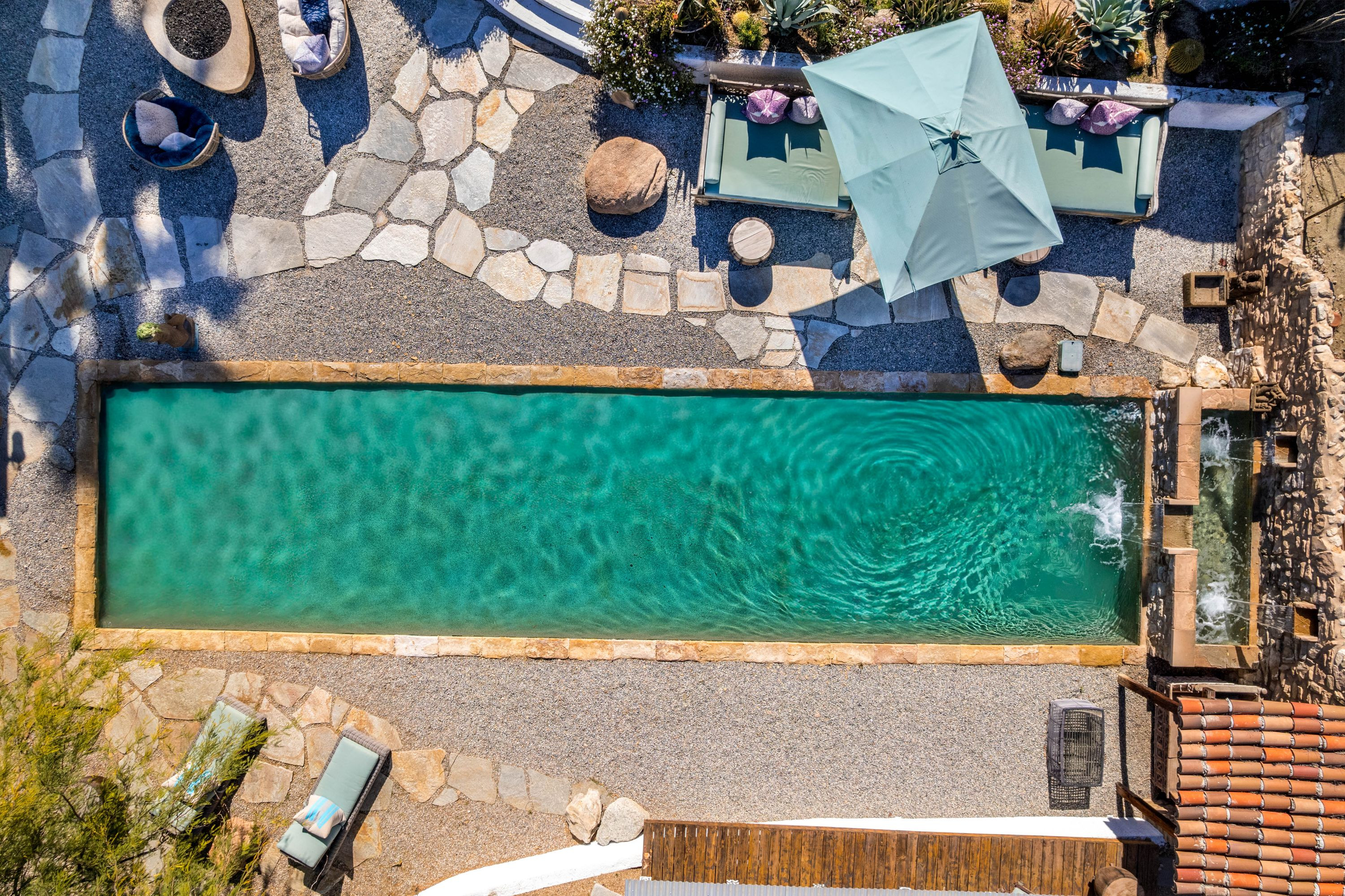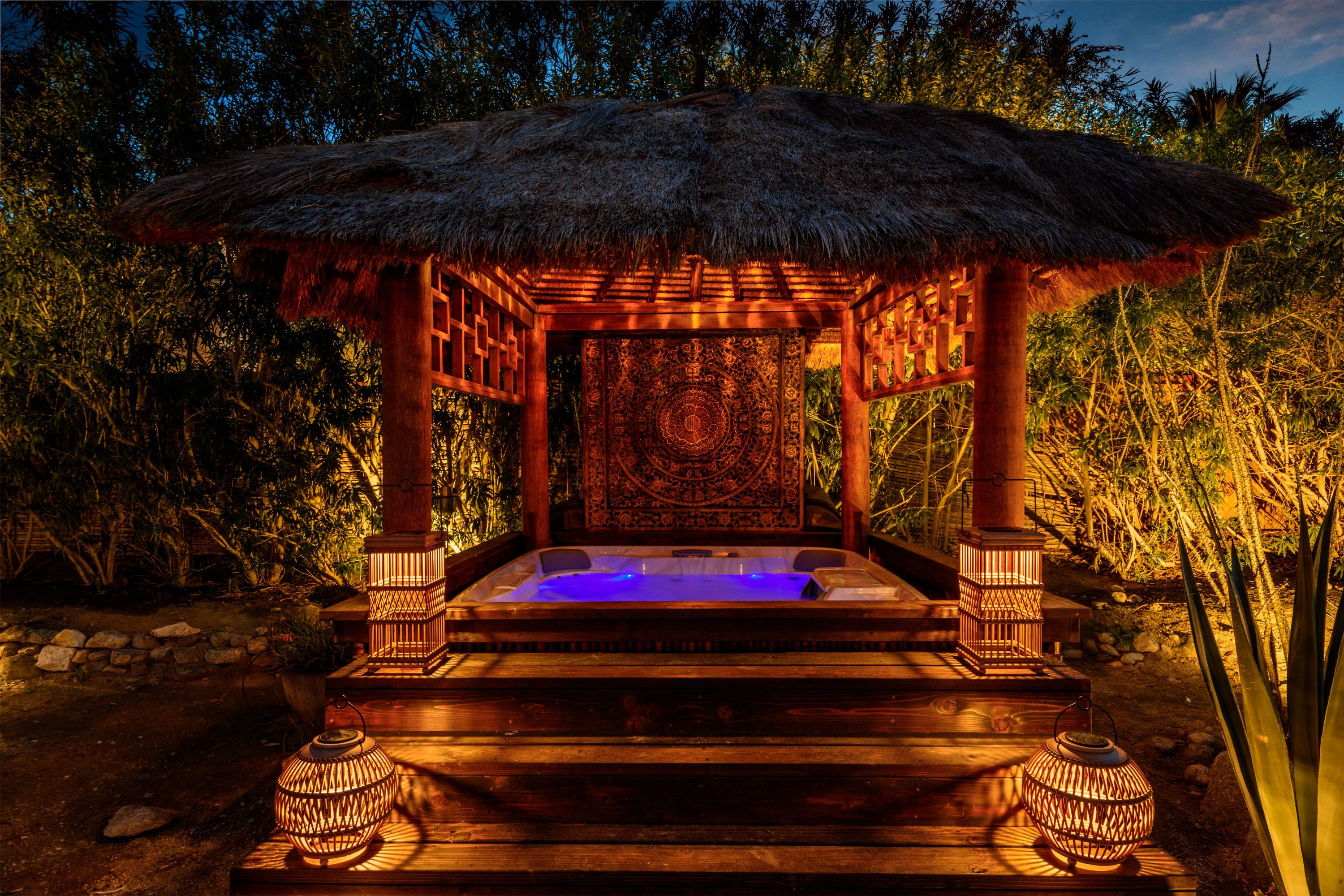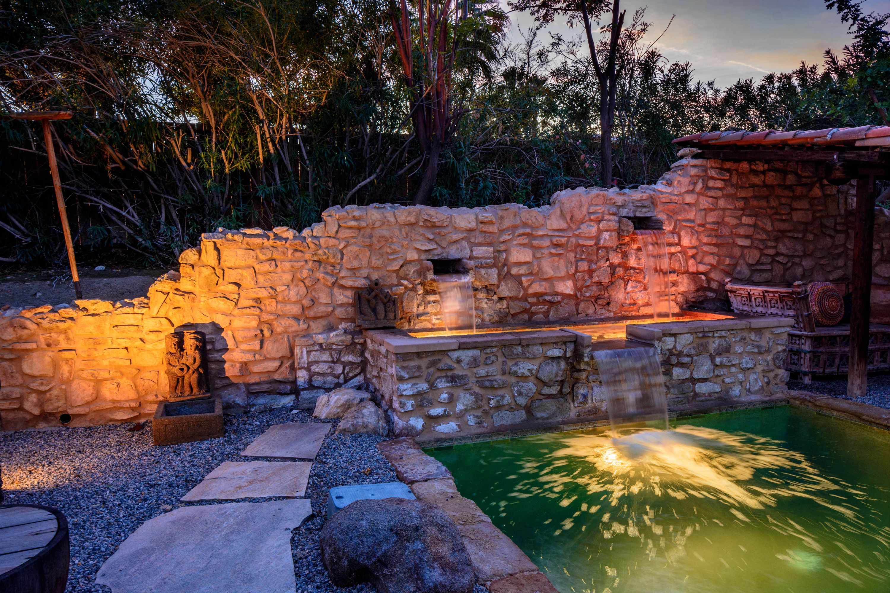 The Moroccan of Rancho Mirage is a true taste of Tangiers in the middle of the Californian desert. Originally built in 1950 this historical estate is a walled, gated oasis sitting on nearly an acre of land. Re-imaged by acclaimed designer Colas Moore it is both full of original charm and well considered luxurious detail. Behind solid mahogany doors a serene fountain lined indoor courtyard welcomes you into the Hacienda style property. The house features a large master suite with private bath at one end and two further bedrooms and a bathroom at the other, with outside soaking tub and shower near guest bedrooms. A newly renovated modern kitchen finished with high end appliances and comfortable dining area flanks the spacious living room featuring vaulted wood beam ceilings, fireplace and quartzite flooring. The adjacent den opens up to a beautifully landscaped garden with citrus trees, magnificent lap pool and shaded napping cabanas. A large outdoor BBQ station and firepit lounge provide the perfect alfresco dining experience complete with panoramic mountain views. There's additional 1114 SF not calculated in assessors' information. New spa added in December 2025.